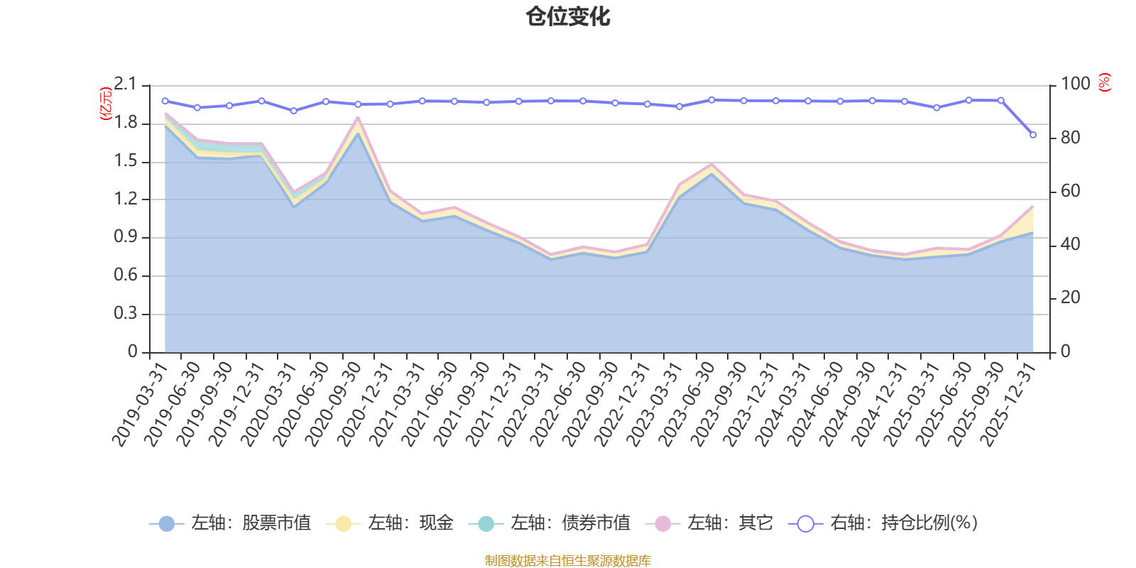 据定期报告数据统计,近三年平均股票仓位为92.74%,同类平均为72.57%。2023年上半年末基金达到94.51%的最高仓位,2025年末最低,为81.43%。