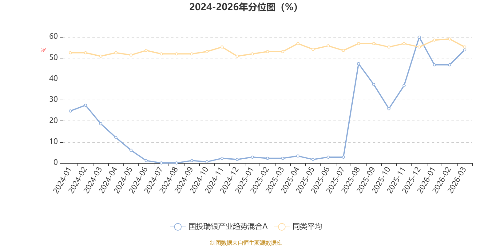 通过所选区间该基金净值增长率分位图,可以观察该基金与同类基金业绩比较情况。图为坐标原点到区间内某时点的净值增长率在同类基金中的分位数。