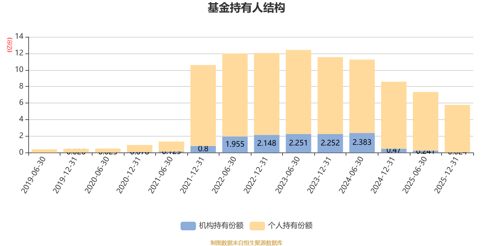 截至2025年12月31日,基金持有人共计7.39万户,合计持有5.78亿份。其中管理人员工持有148.74万份,占比0.26%,机构持有份额占比0.41%,个人投资者占比99.59%。