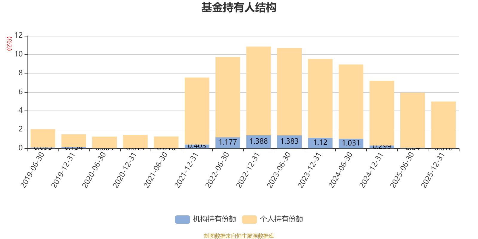 截至2025年12月31日,基金持有人共计9.89万户,合计持有4.99亿份。其中管理人员工持有8.17万份,占比0.02%,机构持有份额占比0.33%,个人投资者占比99.67%。