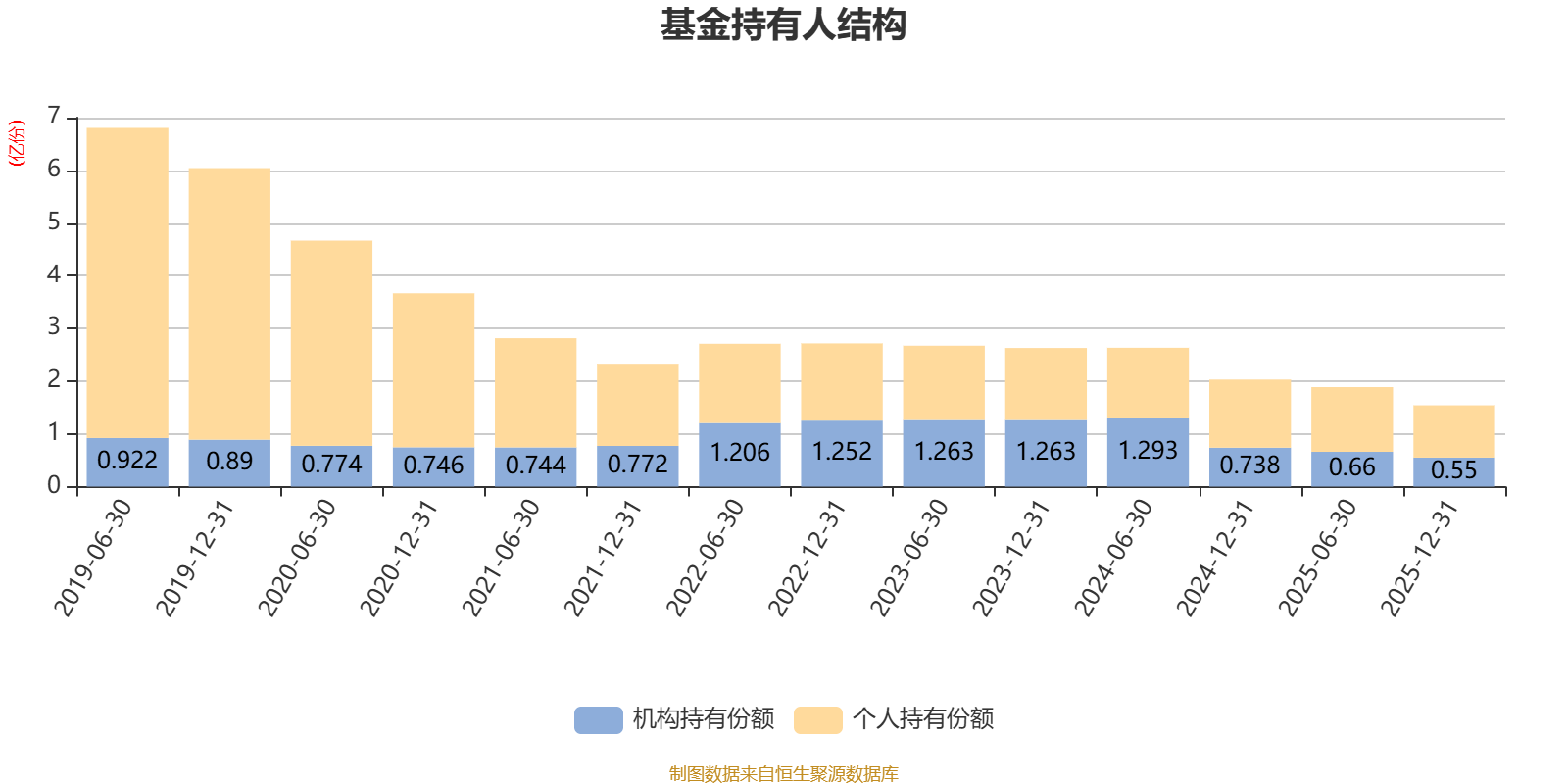 截至2025年12月31日,基金持有人共计1.19万户,合计持有1.54亿份。其中管理人员工持有5.73万份,占比0.04%,机构持有份额占比35.67%,个人投资者占比64.33%。