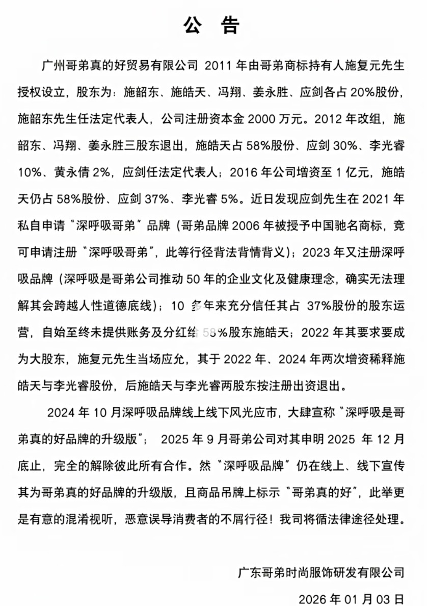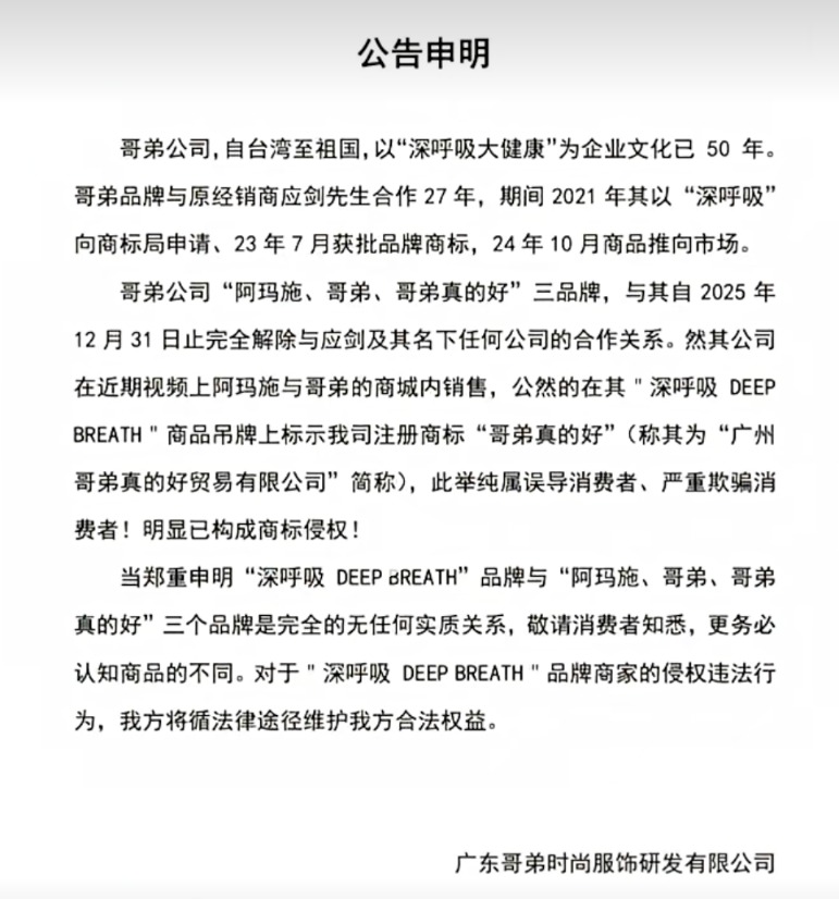 深呼吸母公司在后来的一份公告中表示,由于哥弟公司将“哥弟真的好”剥离出自身体系,“双方经营理念上出现根本分歧”,该公司决定于2025年1月1日起停止使用“哥弟真的好GIRDEAR”商标,启用全新品牌“DEEPBREATH深呼吸”,独立运营。另据该公告,深呼吸母公司与哥弟公司的代理合作授权到2025年12月底才到期,在这之前其仍有权同时销售哥弟、阿玛施的库存产品。