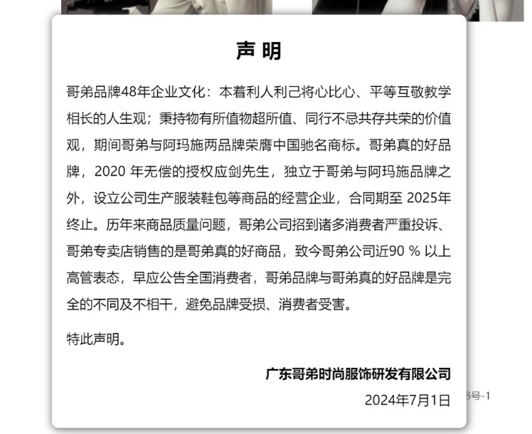 哥弟公司在2024年7月的一份声明中提到,其从2020年起将“哥弟真的好”品牌无偿授权应剑经营,合同期到2025年终止。而双方合作期间,哥弟公司收到诸多消费者投诉“哥弟真的好”商品质量问题,以及“哥弟真的好”商品混入哥弟专卖店内销售。因此,哥弟公司特意发此声明表态:“哥弟品牌与哥弟真的好品牌是完全的不同及不相干”。