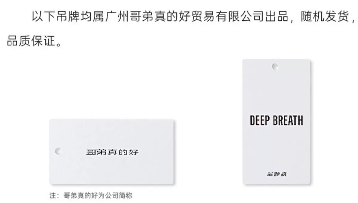 另一纠纷点在于,深呼吸在其吊牌上印着“哥弟真的好”,并标注这是其公司名简称。而在哥弟公司看来,此举是“混淆视听,恶意误导消费者”。深呼吸母公司对此回应称,其公司注册时间为2011年,远早于哥弟公司注册“哥弟真的好GIRDEAR”商标时的2020年,“合法使用在先的企业字号受法律保护。”