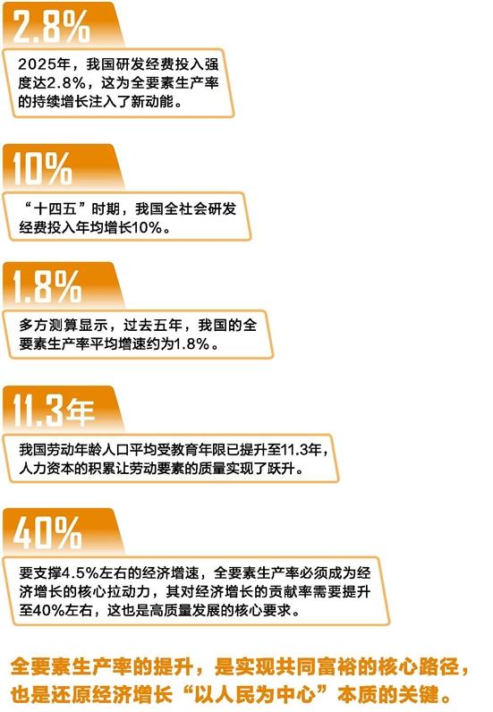 在传统要素驱动边际效应递减的背景下,全要素生产率,即要素投入转化为产出的总体效率,已成为影响中国经济潜在增速的核心变量。提升全要素生产率,归根结底要靠科技创新与制度改革的协同发力。2025年,我国研发经费投入强度达2.8%,首次超过经济合作与发展组织(OECD)国家平均水平,这为全要素生产率的持续增长注入了新动能。