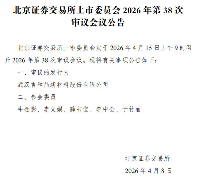 4月8日晚间,北交所官网显示,武汉吉和昌新材料股份有限公司(简称“吉和昌”)IPO将于4月15日上会迎考。