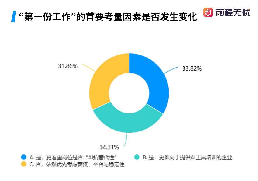 前程无忧的数据显示:在职业选择标准上,约68%的受访毕业生表示其求职考量已发生变化。其中,三分之一受访毕业生更关注“岗位的AI抗替代性”。这意味着,AI不仅改变了求职方式,也在重塑职业价值判断。相比传统的“薪资、平台、稳定性”三要素,新一代毕业生开始将“技术适配能力”纳入核心考量。