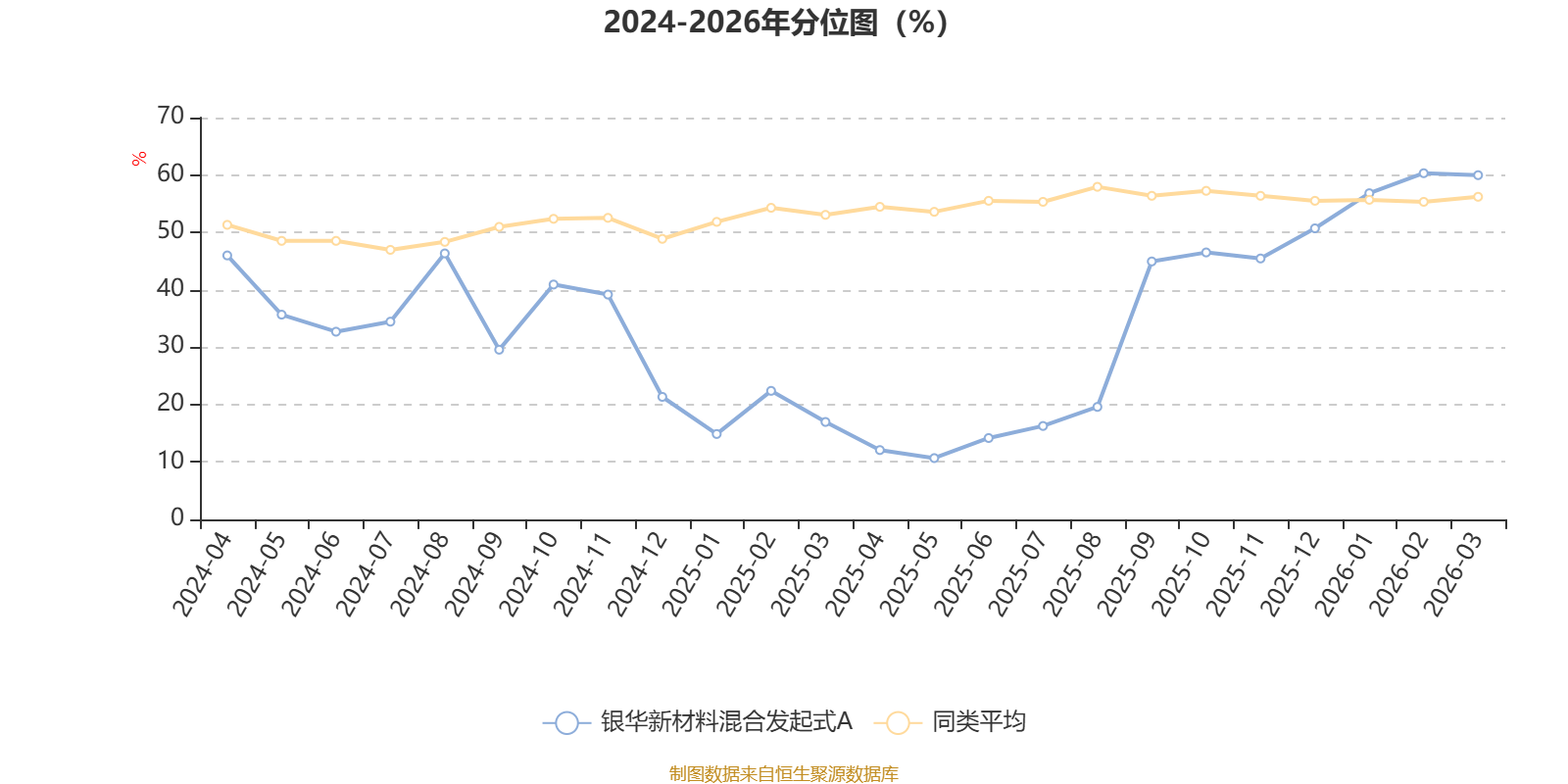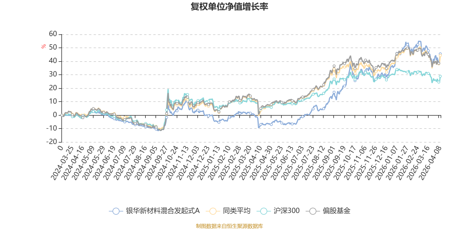 截至4月8日,银华新材料混合发起式A近三个月复权单位净值增长率为0.78%,位于同类可比基金302/689;近半年复权单位净值增长率为8.51%,位于同类可比基金202/689;近一年复权单位净值增长率为59.83%,位于同类可比基金157/685。