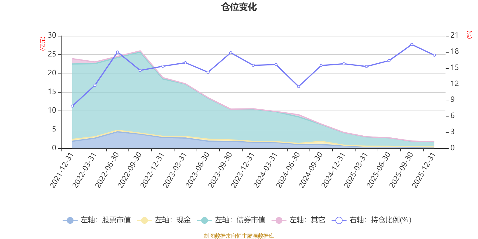 据定期报告数据统计,近三年平均股票仓位为15.87%,同类平均为19.2%。2025年三季度末基金达到19.39%的最高仓位,2021年末最低,为7.89%。