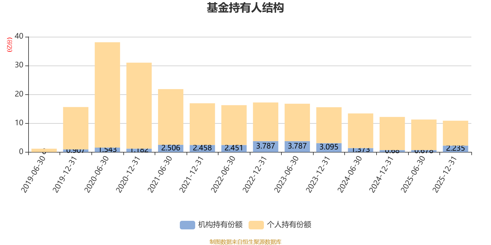 截至2025年12月31日,基金持有人共计9.7万户,合计持有10.87亿份。其中管理人员工持有116.38万份,占比0.11%,机构持有份额占比20.56%,个人投资者占比79.44%。
