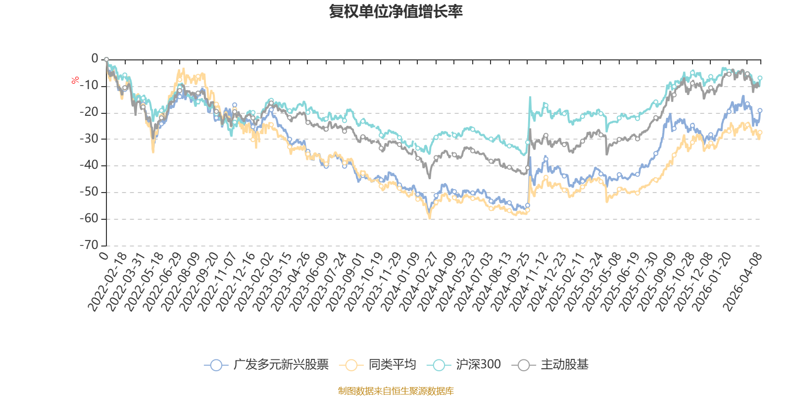 截至4月8日,广发多元新兴股票近三个月复权单位净值增长率为4.17%,位于同类可比基金7/39;近半年复权单位净值增长率为5.35%,位于同类可比基金13/39;近一年复权单位净值增长率为53.91%,位于同类可比基金20/39;近三年复权单位净值增长率为17.14%,位于同类可比基金16/33。