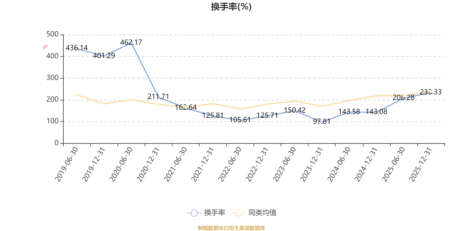 截至2025年12月31日,基金最近一年换手率约444.74%,持续5年低于同类均值。