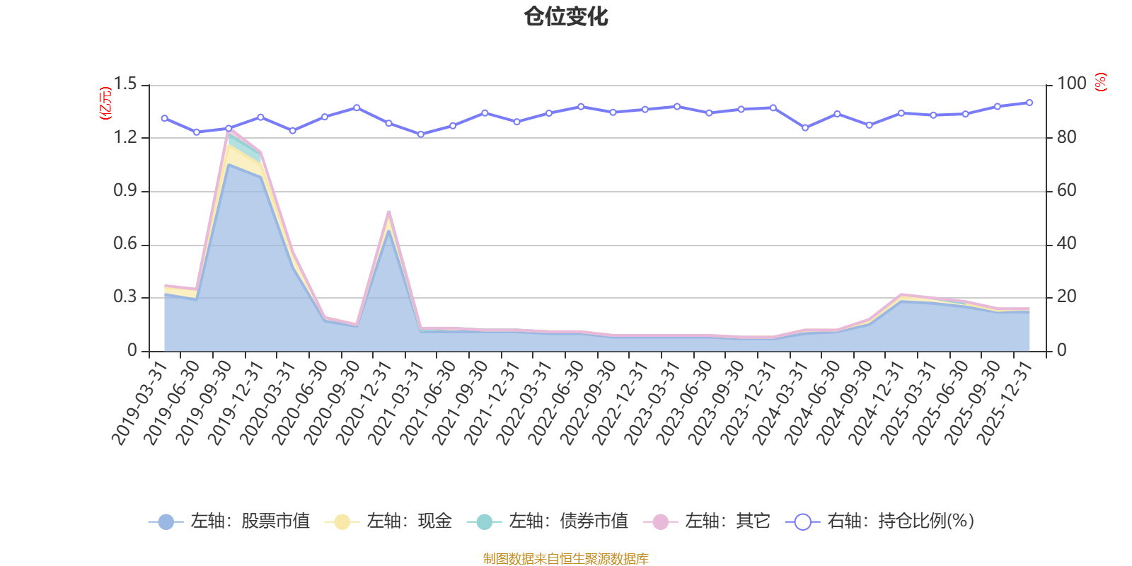 据定期报告数据统计,近三年平均股票仓位为89.5%,同类平均为88.34%。2025年末基金达到93.38%的最高仓位,2021年一季度末最低,为81.46%。
