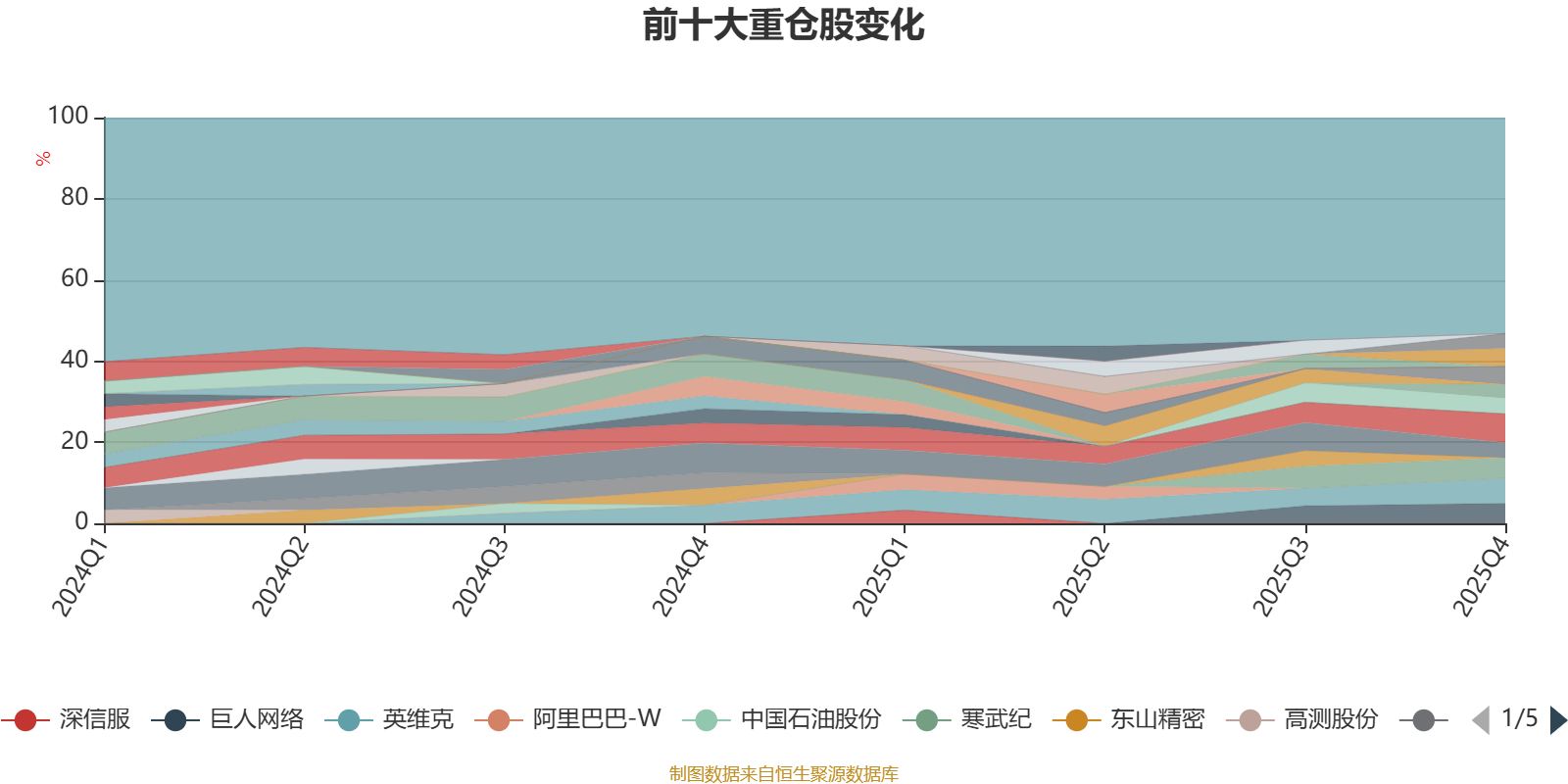 截至2025年末,基金十大重仓股分别是菲利华、英维克、寒武纪、巨人网络、中际旭创、新易盛、中金黄金、赤峰黄金、欣旺达、西部矿业。
