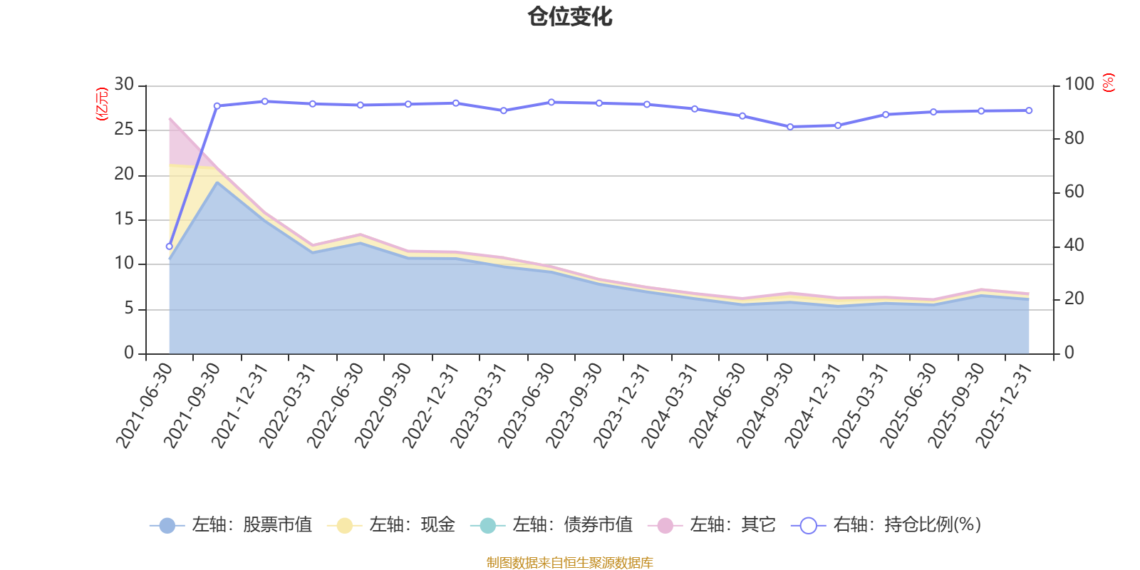 据定期报告数据统计,近三年平均股票仓位为90.08%,同类平均为86.12%。2021年末基金达到94.09%的最高仓位,2021年上半年末最低,为40.02%。