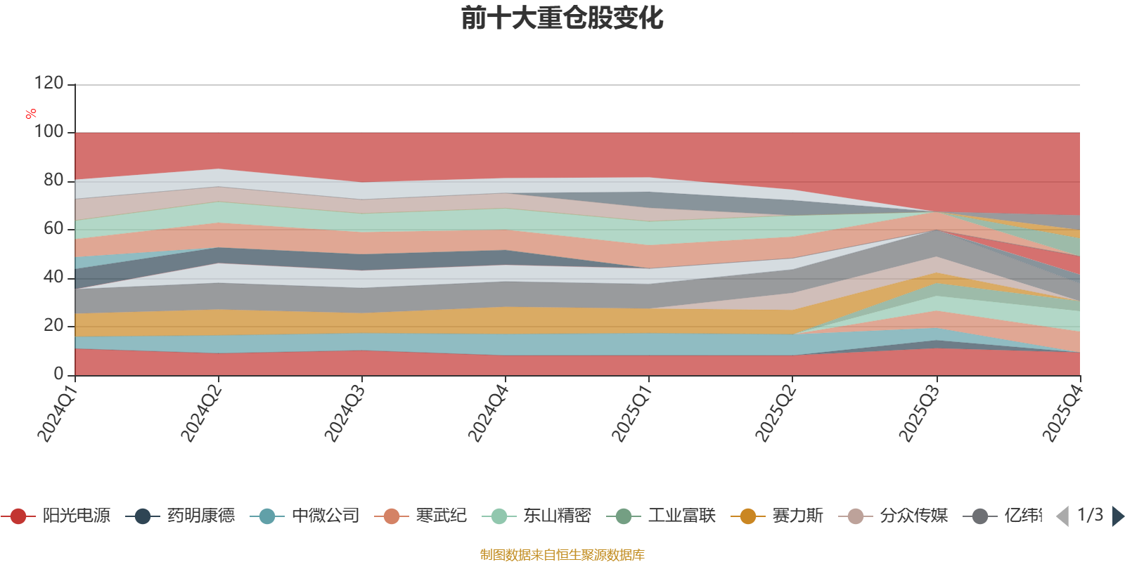 该基金持股集中度较高,近2年前十大重仓股集中度长期超过60%。截至2025年末,基金十大重仓股分别是阳光电源、寒武纪、东山精密、新易盛、中际旭创、亿纬锂能、中芯国际、工业富联、复旦微电、胜宏科技。