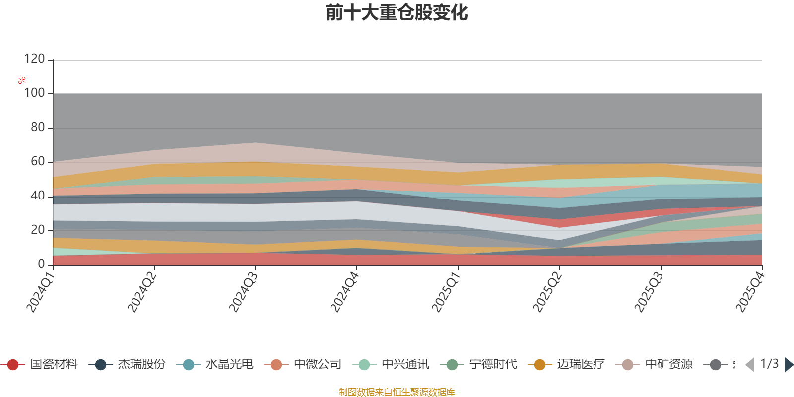 该基金持股集中度较高。截至2025年末,基金十大重仓股分别是杰瑞股份、立讯精密、国瓷材料、宁德时代、中微公司、ST人福、惠泰医疗、中矿资源、华测检测、水晶光电。