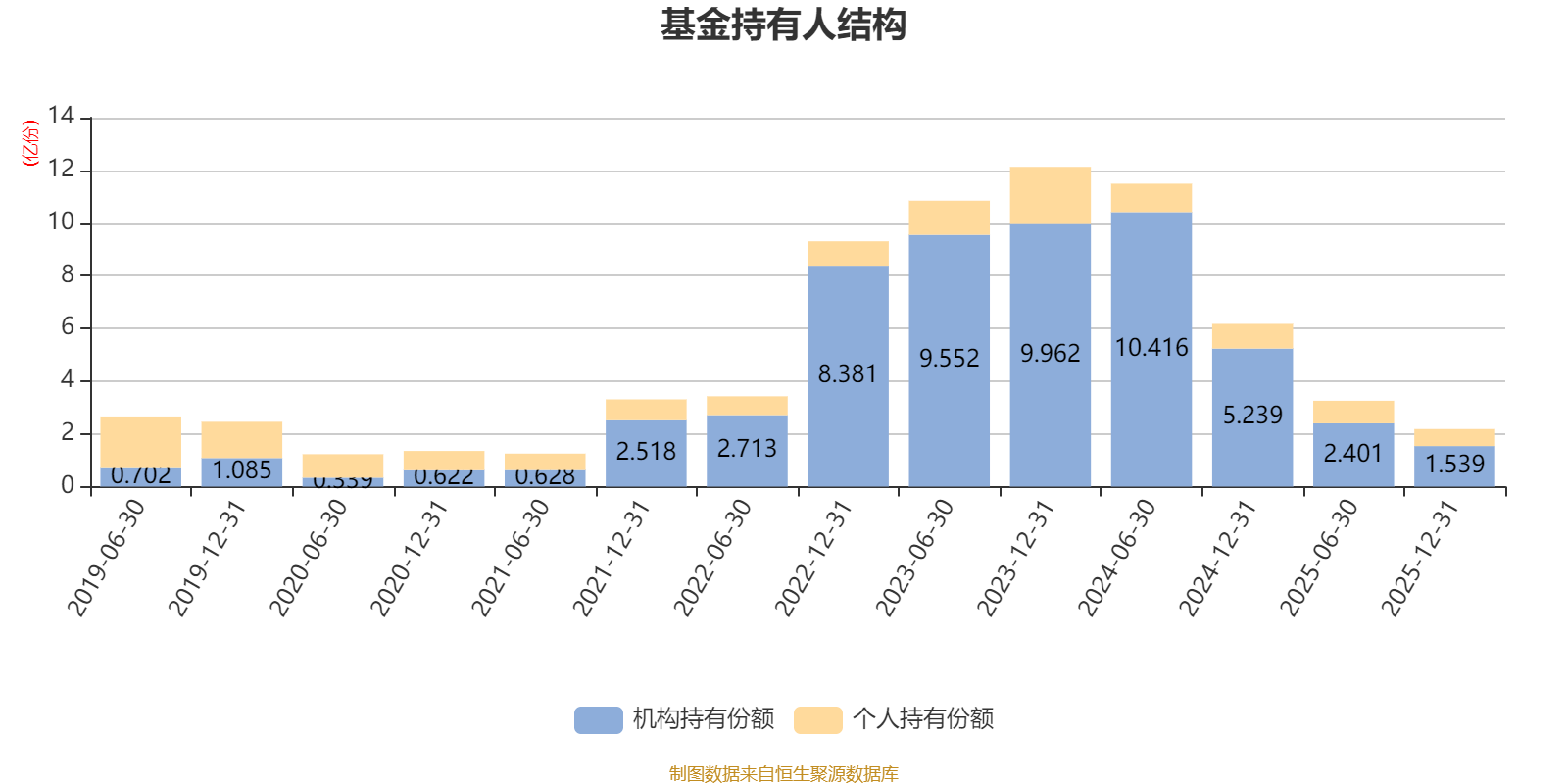 截至2025年12月31日,基金持有人共计3930户,合计持有2.18亿份。其中管理人员工持有207.36万份,占比0.95%,机构持有份额占比70.48%,个人投资者占比29.52%。