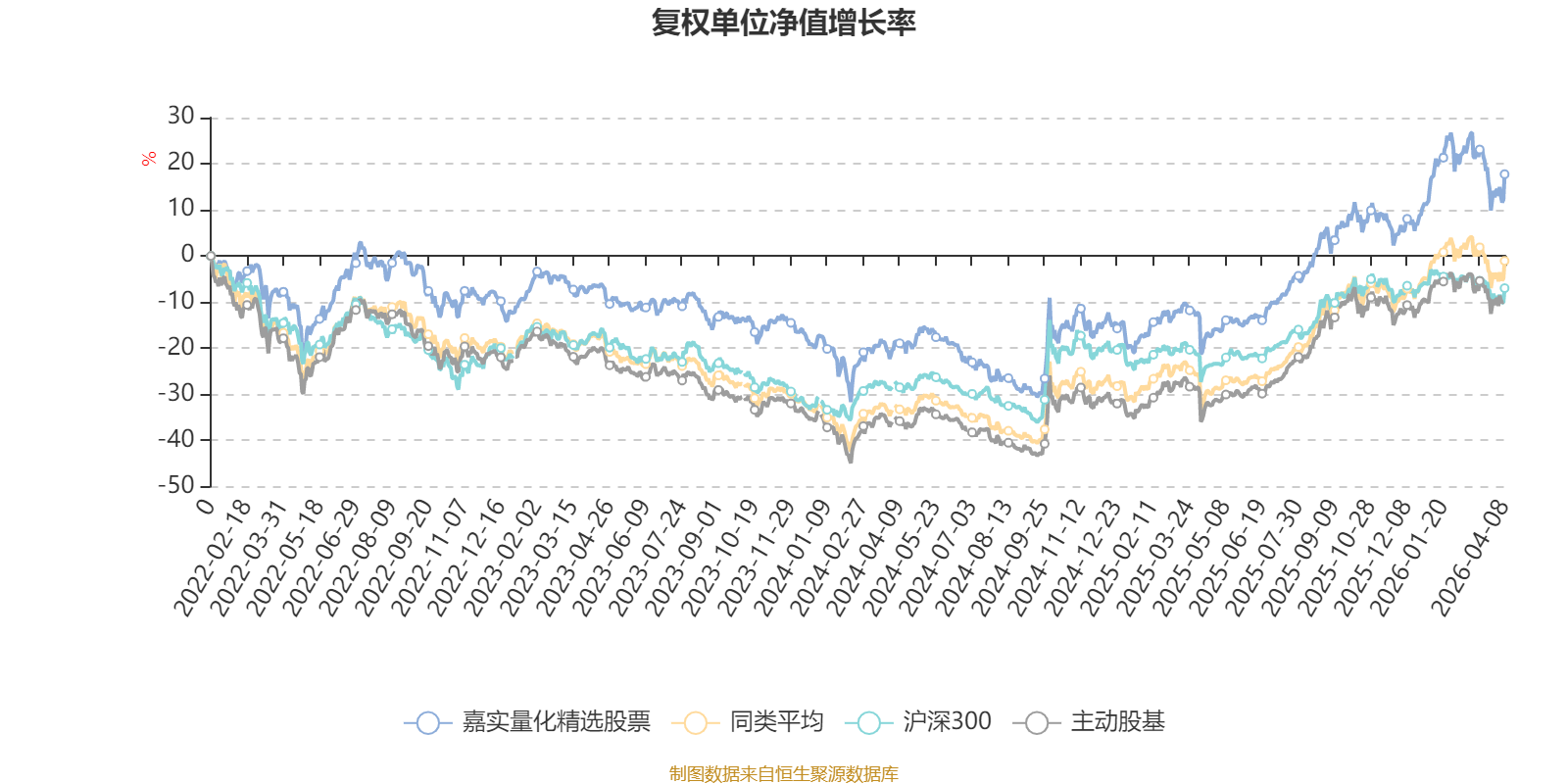 截至4月8日,嘉实量化精选股票近三个月复权单位净值增长率为0.39%,位于同类可比基金72/167;近半年复权单位净值增长率为7.17%,位于同类可比基金58/167;近一年复权单位净值增长率为48.80%,位于同类可比基金71/165;近三年复权单位净值增长率为25.51%,位于同类可比基金62/157。
