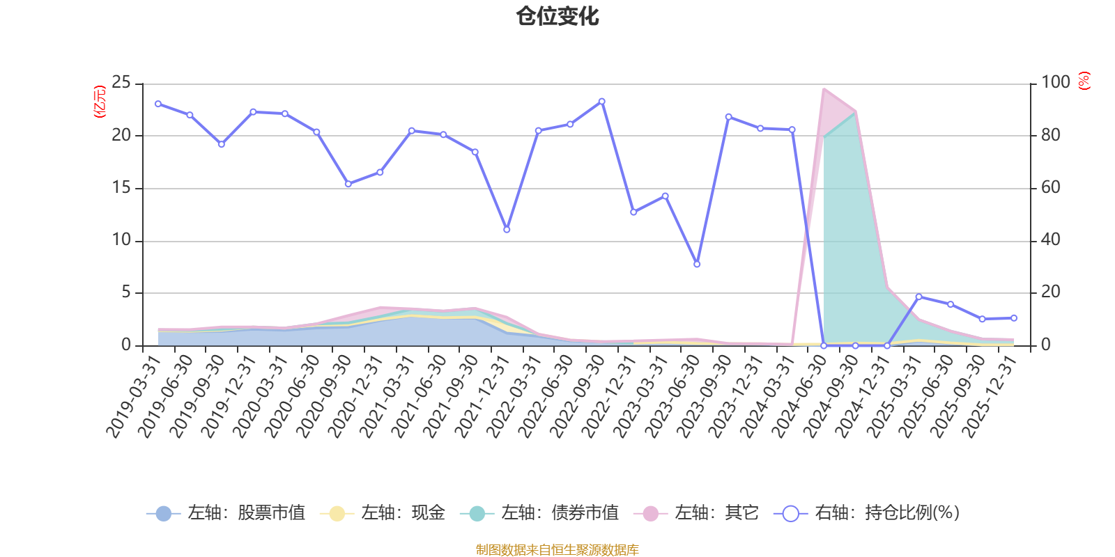 据定期报告数据统计,近三年平均股票仓位为33%,同类平均为72.57%。2022年三季度末基金达到93.2%的最高仓位,2025年三季度末最低,为10.18%。