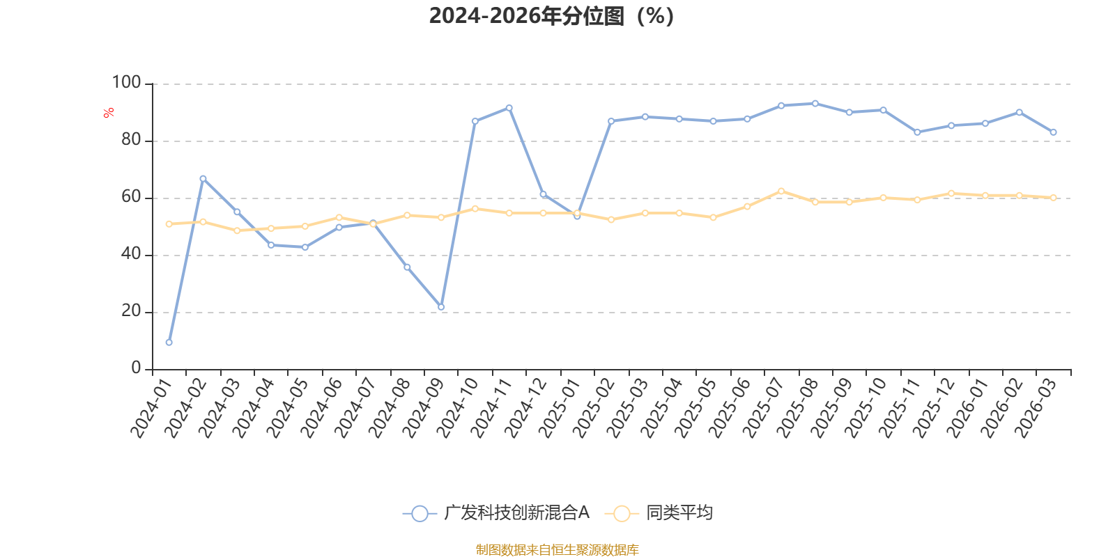 通过所选区间该基金净值增长率分位图,可以观察该基金与同类基金业绩比较情况。图为坐标原点到区间内某时点的净值增长率在同类基金中的分位数。