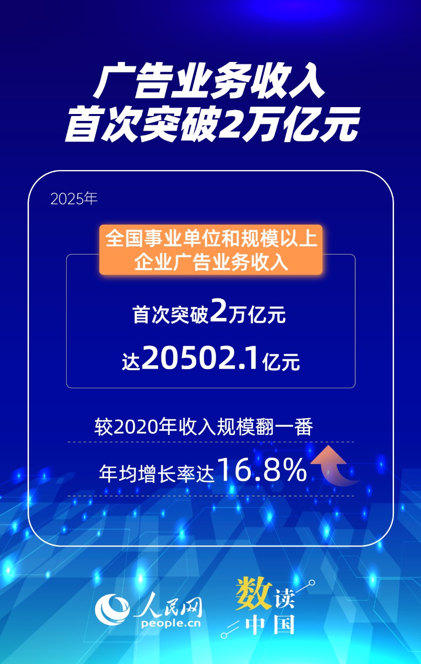 2025年,全国事业单位和规模以上企业广告业务收入首次突破2万亿元,较2020年收入规模翻一番;互联网广告业务收入13574.3亿元,比上年增长34.6%……我国广告产业保持快速发展,反映了企业预期向好和市场消费信心,为构建现代化产业体系提供了专业化支撑。