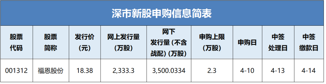 2026年4月10日,杭州福恩股份有限公司(简称:福恩股份)将通过深交所网下发行电子平台和交易系统发行新股,具体信息如下。