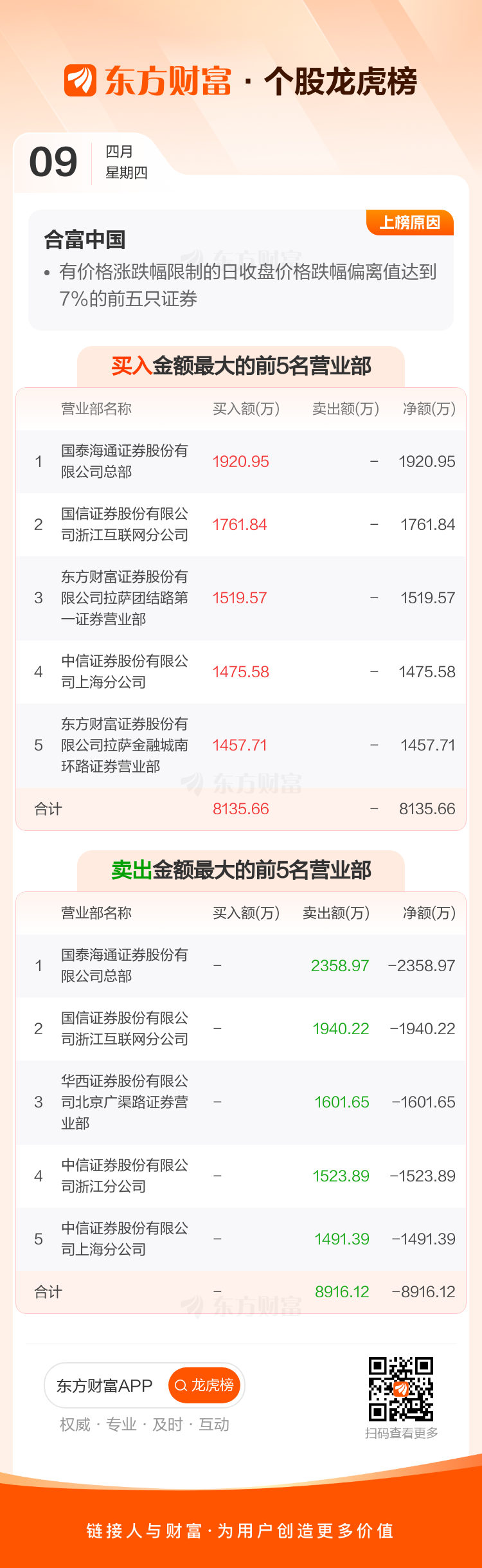 交易所2026年4月9日公布的交易公开信息显示,合富中国因成为有价格涨跌幅限制的日收盘价格跌幅偏离值达到7%的前五只证券上榜。合富中国当日收报18.32元,涨跌幅-7.80%,偏离值-7.08%,换手率18.49%,成交额13.73亿。