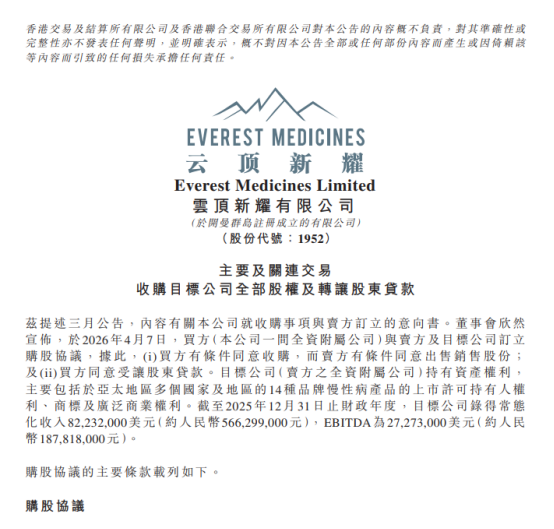 值得注意的是,本次交易构成关联交易,卖方海森生物制药(亚洲)有限公司由云顶新耀大股东康桥资本(CBC)间接持股,存在利益冲突隐患。