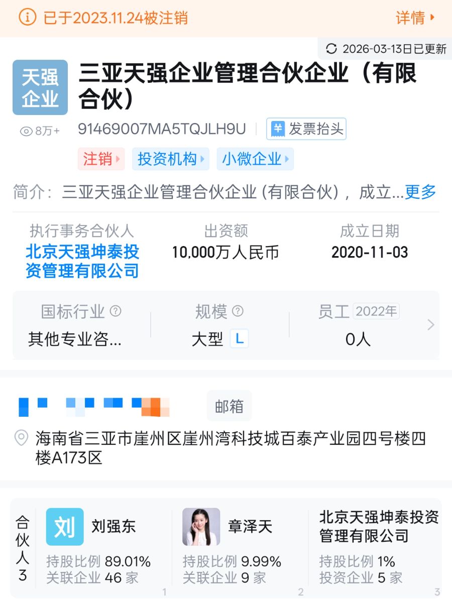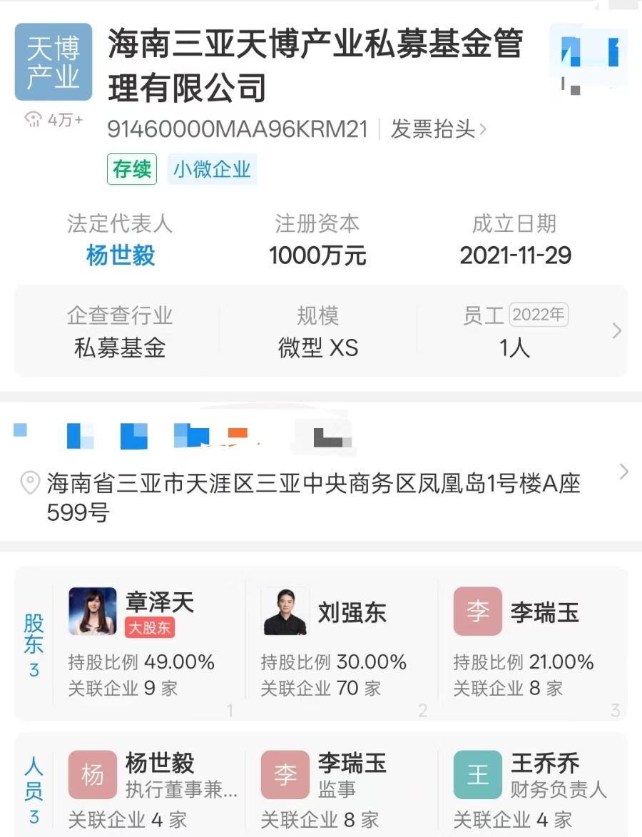 其中,海南三亚天博产业私募基金管理有限公司成立于2021年,章泽天持股49%,刘强东持股30%,李瑞玉持股21%。