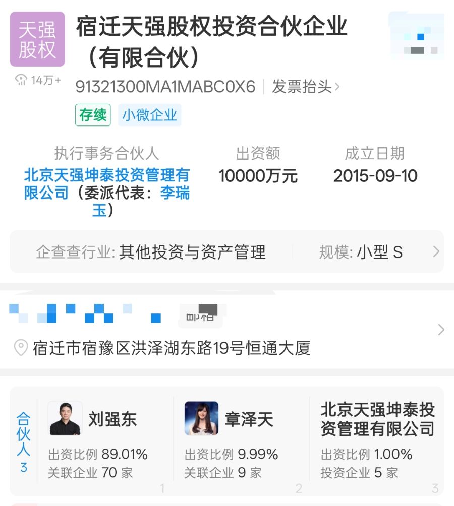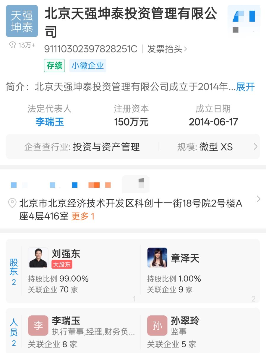 企查查APP显示,近日,宿迁天强企业管理有限公司成立,法定代表人为李瑞玉,注册资本为1000万元,经营范围包含企业管理、信息技术咨询服务、计算机软硬件及辅助设备批发等,由北京天强坤泰投资管理有限公司全资持股,后者由刘强东、章泽天共同持股。