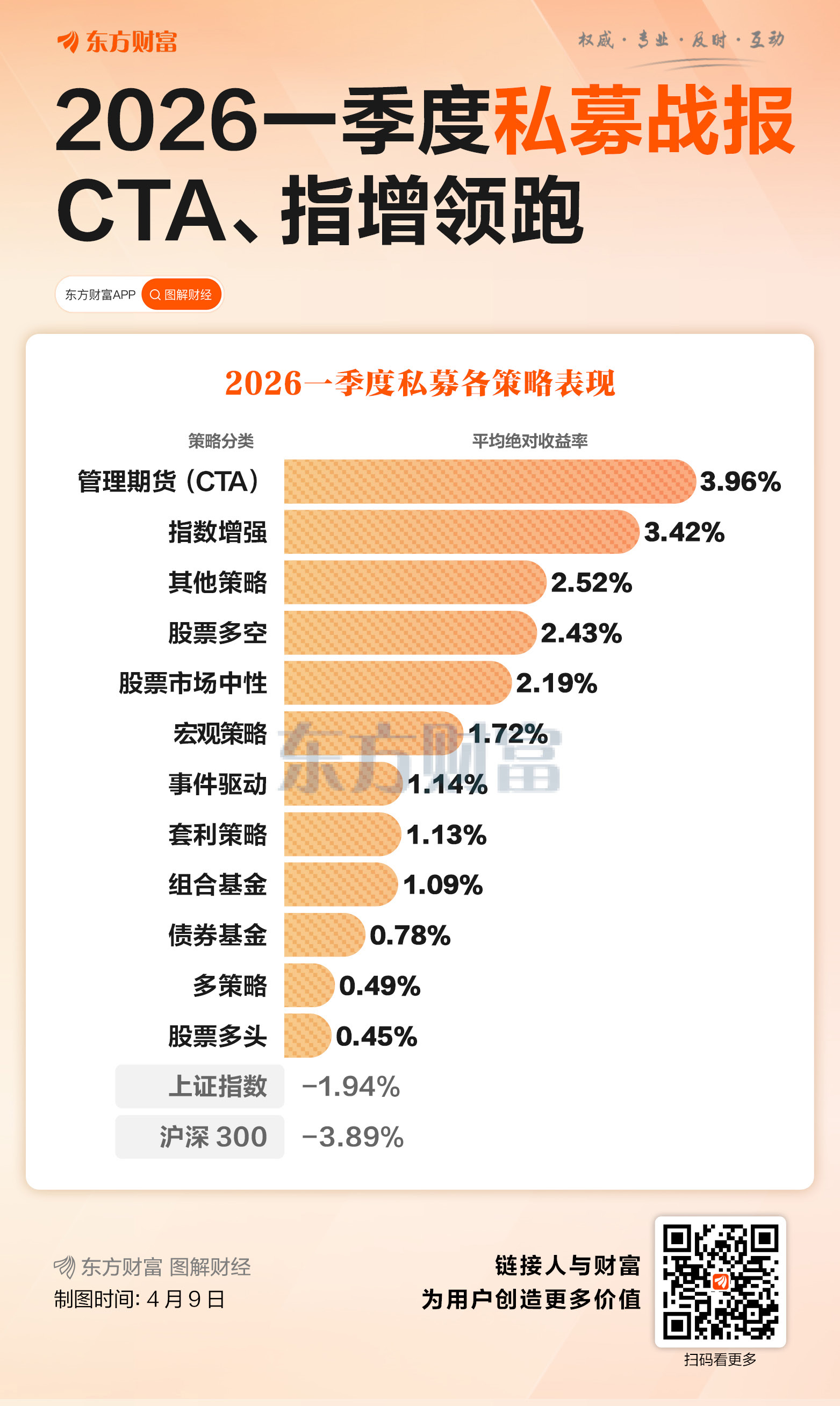 数据显示,2026年一季度私募各策略产品中,CTA策略以3.96%的平均绝对收益率登顶,指数增强策略紧随其后,以3.42%的收益位居第二,两大策略大幅跑赢大盘,也领先股票多空(2.43%)、股票市场中性(2.19%)等其他私募策略。