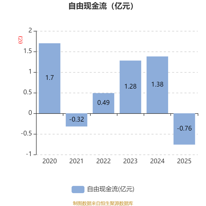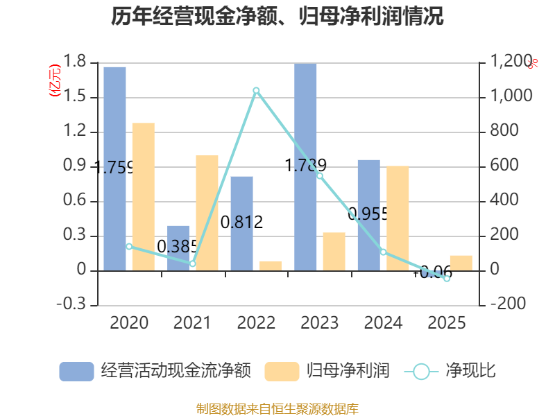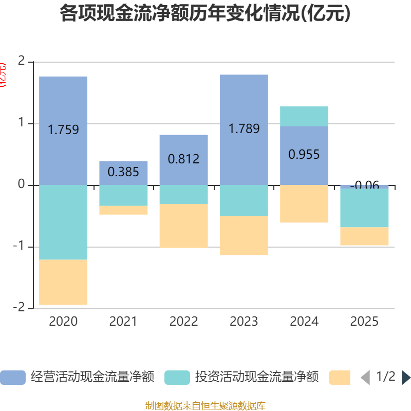截至2025年,公司经营活动现金流净额为-603.87万元,同比减少1.02亿元;筹资活动现金流净额-2918.8万元,同比增加3179.96万元;投资活动现金流净额-6265.2万元,上年同期为3189.71万元。