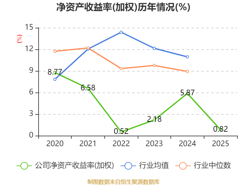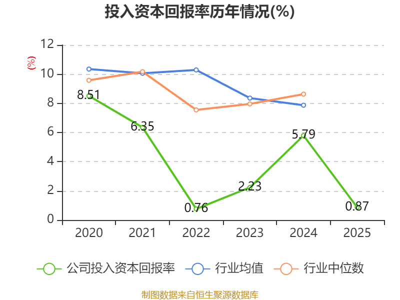 数据显示,2025年公司加权平均净资产收益率为0.82%,较上年同期下降5.05个百分点。公司2025年投入资本回报率为0.87%,较上年同期下降4.92个百分点。