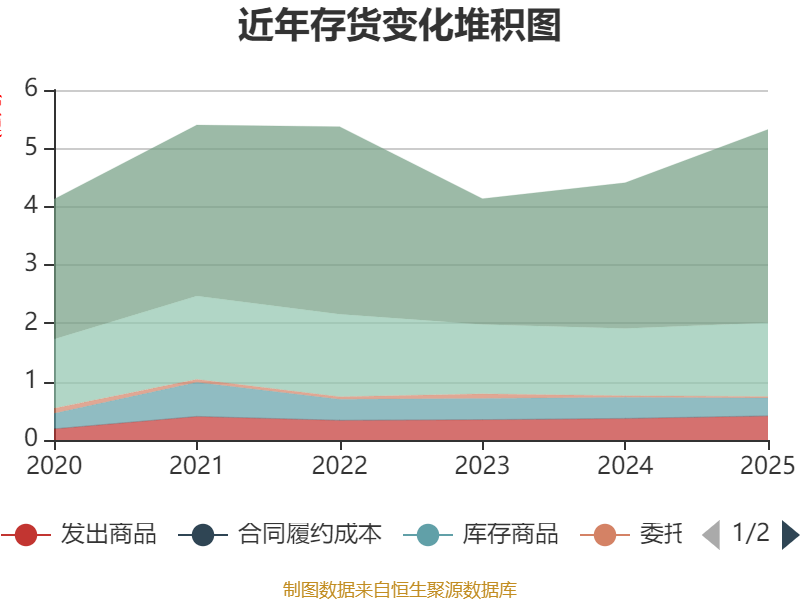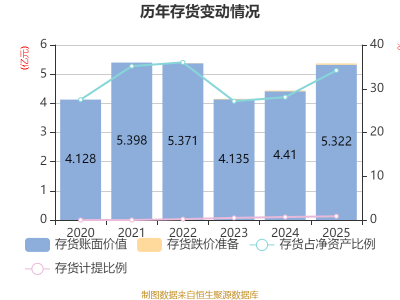 从存货变动来看,截至2025年末,公司存货账面价值为5.32亿元,占净资产的34.19%,较上年末增加9124.49万元。其中,存货跌价准备为457.6万元,计提比例为0.85%。