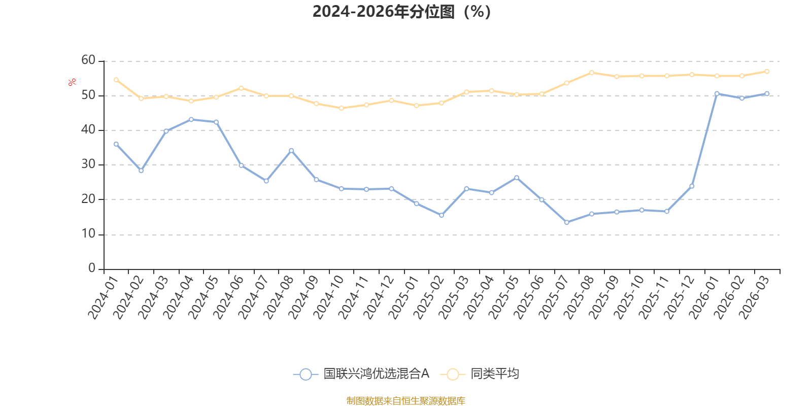 通过所选区间该基金净值增长率分位图,可以观察该基金与同类基金业绩比较情况。图为坐标原点到区间内某时点的净值增长率在同类基金中的分位数。