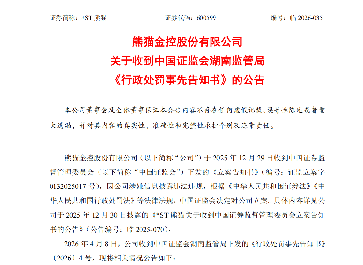 熊猫金控不仅存在审计报告被出具无法表示意见和否定意见而退市的风险,还因小贷债权虚假交易而被监管重罚。4月8日,熊猫金控收到中国证监会湖南监管局下发的《行政处罚事先告知书》〔2026〕4号。