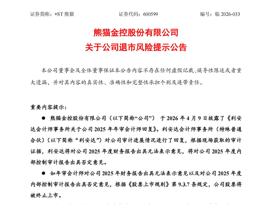 4月9日,熊猫金控(证券简称:*ST熊猫)发布退市风险提示公告,根据现场获取的审计证据,熊猫金控聘请的利安达会计师事务所(特殊普通合伙)(下称“利安达”)将对熊猫金控2025年度财务报告出具无法表示意见,并对2025年度内部控制审计报告出具否定意见,熊猫金控股票存在重大退市风险。