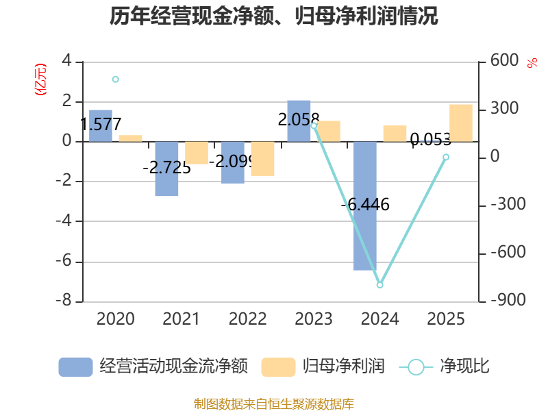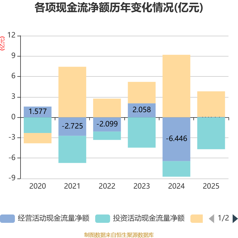 截至2025年,公司经营活动现金流净额为526.39万元,同比增加6.5亿元;筹资活动现金流净额3.77亿元,同比减少5.43亿元;投资活动现金流净额-4.69亿元,上年同期为-2.29亿元。