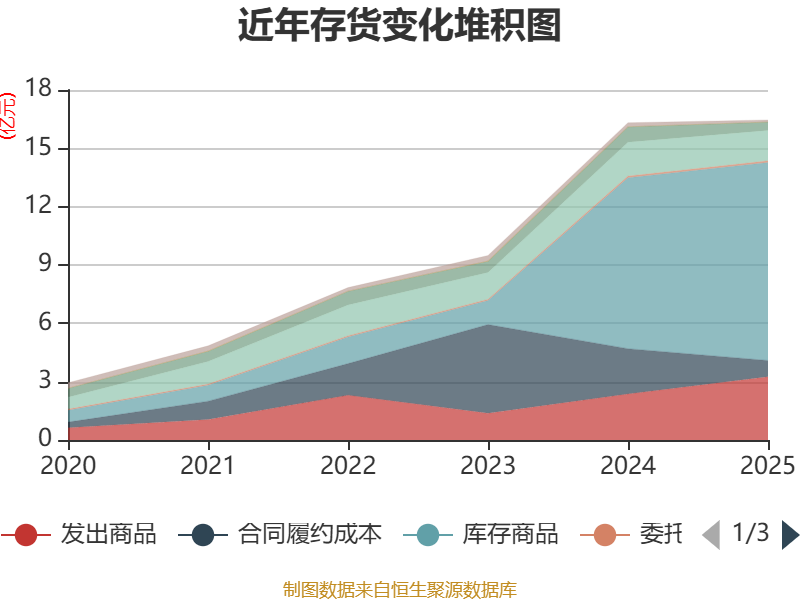 从存货变动来看,截至2025年末,公司存货账面价值为16.46亿元,占净资产的90.61%,较上年末增加1442.69万元。其中,存货跌价准备为420.41万元,计提比例为0.25%。