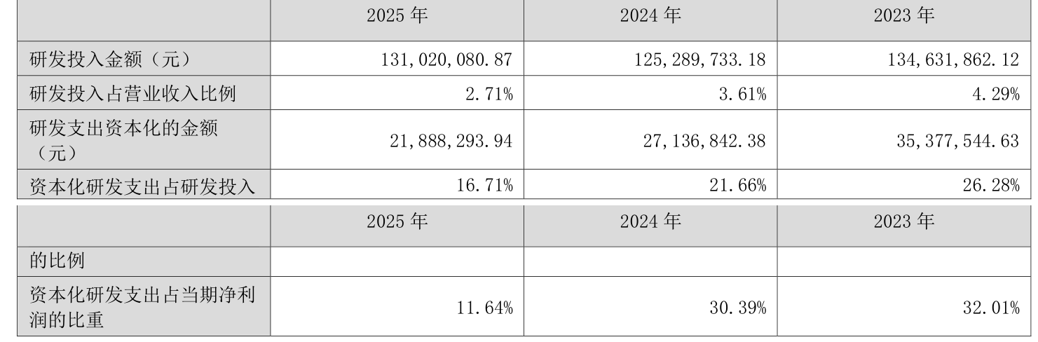 2025年全年,公司研发投入金额为1.31亿元,同比增长4.57%;研发投入占营业收入比例为2.71%,相比上年同期下降0.9个百分点。此外,公司全年研发投入资本化率为16.71%。