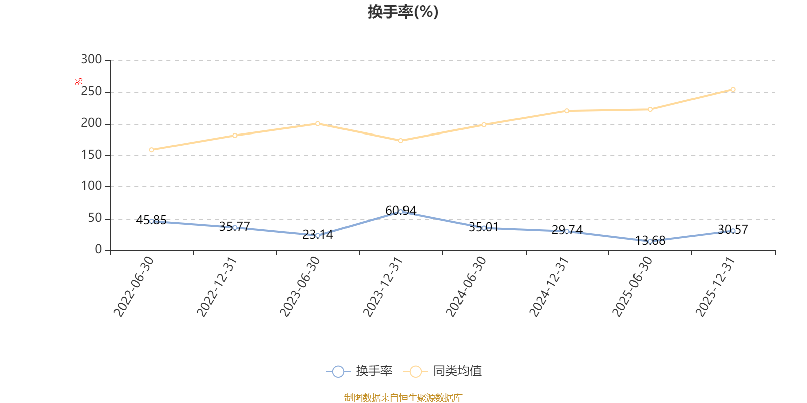 截至2025年12月31日,基金最近一年换手率约43.61%,持续低于同类均值。
