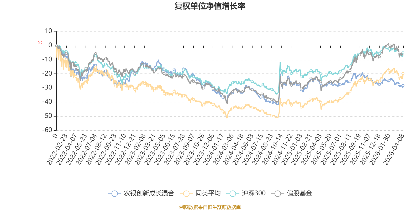 截至4月8日,农银创新成长混合近三个月复权单位净值增长率为-4.58%,位于同类可比基金486/621;近半年复权单位净值增长率为-10.72%,位于同类可比基金562/621;近一年复权单位净值增长率为3.66%,位于同类可比基金607/618;近三年复权单位净值增长率为-20.36%,位于同类可比基金534/559。