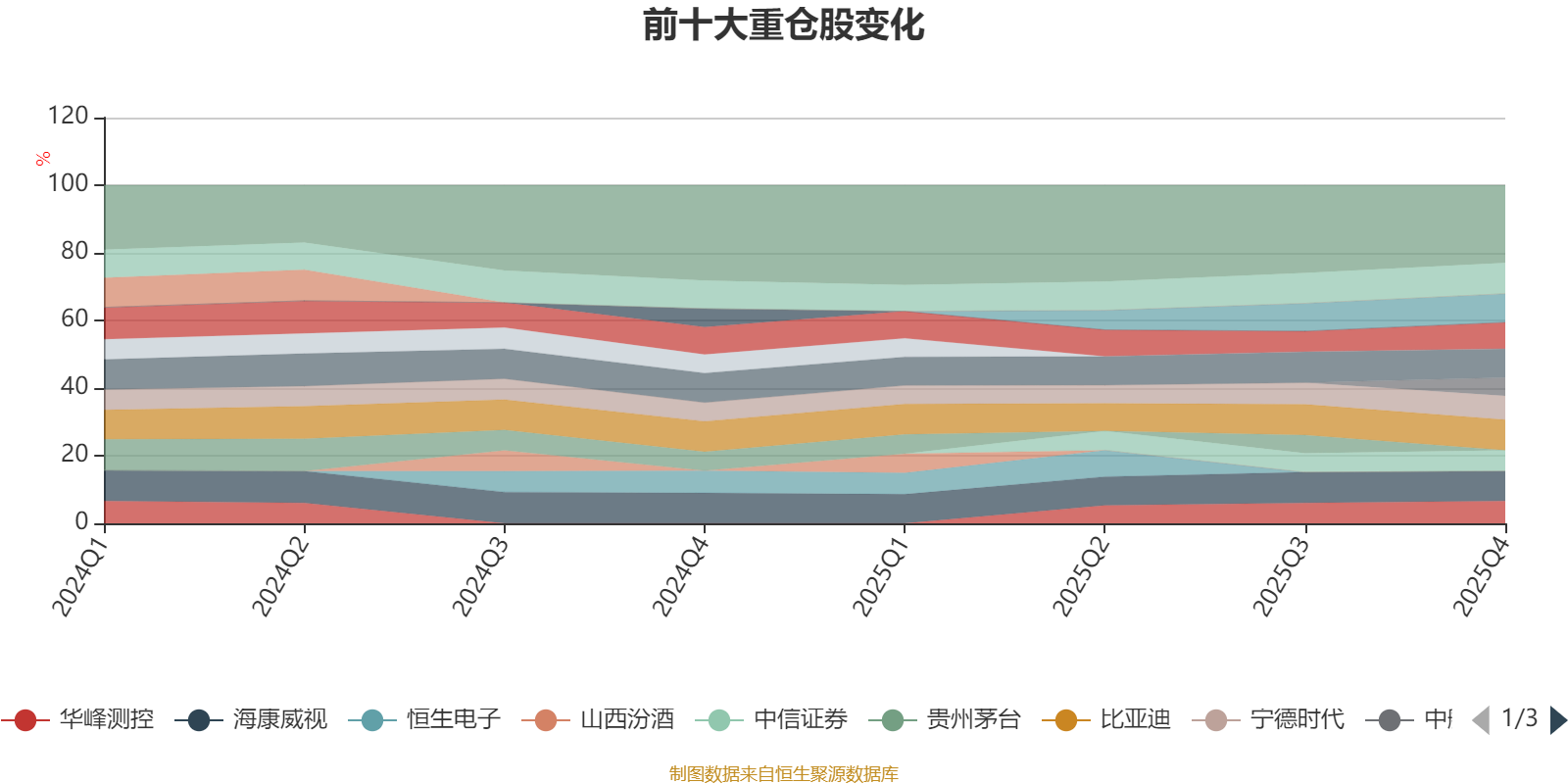 该基金持股集中度较高,且持股标的较为稳定,近2年前十大重仓股集中度长期超过60%。截至2025年末,基金十大重仓股分别是柏楚电子、比亚迪、海康威视、迈瑞医疗、东方财富、招商银行、宁德时代、华峰测控、中信证券、中航沈飞。