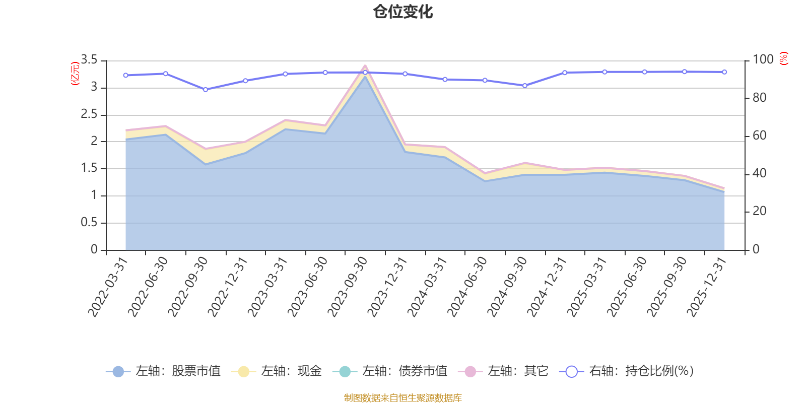 据定期报告数据统计,近三年平均股票仓位为92.41%,同类平均为85.83%。2025年三季度末基金达到94.1%的最高仓位,2022年三季度末最低,为84.62%。