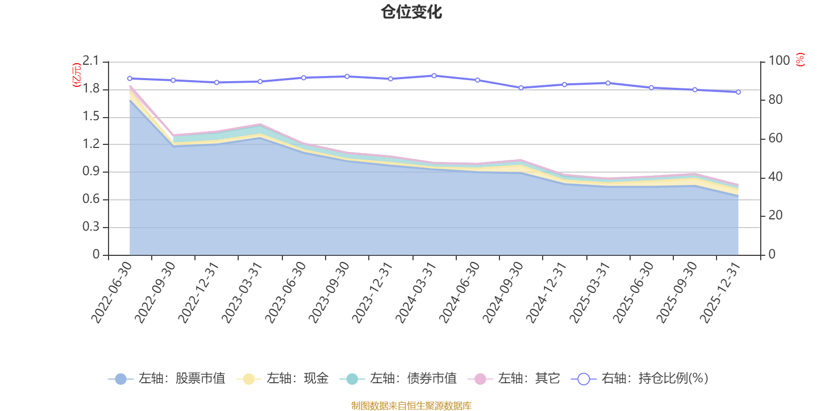 据定期报告数据统计,近三年平均股票仓位为89%,同类平均为84.04%。2024年一季度末基金达到92.74%的最高仓位,2025年末最低,为84.28%。
