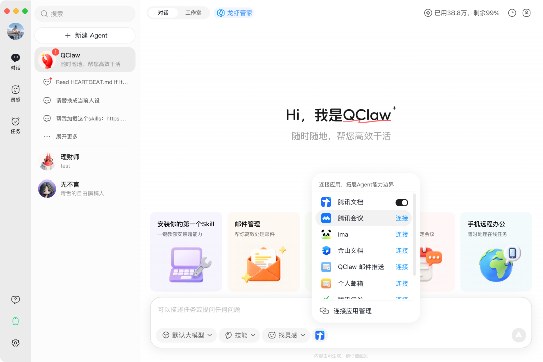 记者了解到,针对入门用户,QClaw还预设了三位风格迥异的Agent:无不言,毒舌的自由撰稿人;林且慢,耐心细致的辅导员;代可行,务实的程序员。