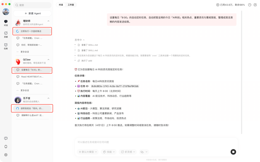 这三个Agent已预先配置相应skills,用户可以直接使用其执行任务。例如:同时让“无不言”写推送文案、让“代可行”写代码,并让“林且慢”梳理和复盘上周的工作进展。三者“各司其职”,可同步开工、互不干扰,从而大幅缩短任务总耗时。