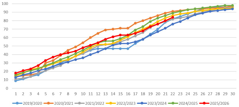 图为玉米周度售粮进度(%)