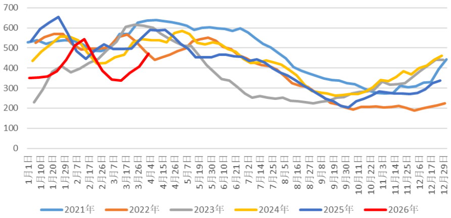 供应端,截至4月2日,据Mysteel玉米团队统计,全国13个省份农户售粮进度为85%,较去年同期慢4个百分点;东北售粮进度为86%,较去年同期慢3个百分点;华北售粮进度为80%,较去年同期慢7个百分点。整体售粮进度明显滞后于往年同期水平。3月底,产区气温逐步回升,“地趴粮”存储难度上升,基层出货意愿提升。短期玉米上量节奏有望延续,但余粮已不足两成。基层可售粮源整体偏紧,难以形成明显卖压。进入4月中下旬,农户余粮基本完成向贸易商的流转,贸易商惜售情绪大概率升温,市场价格难有深跌。